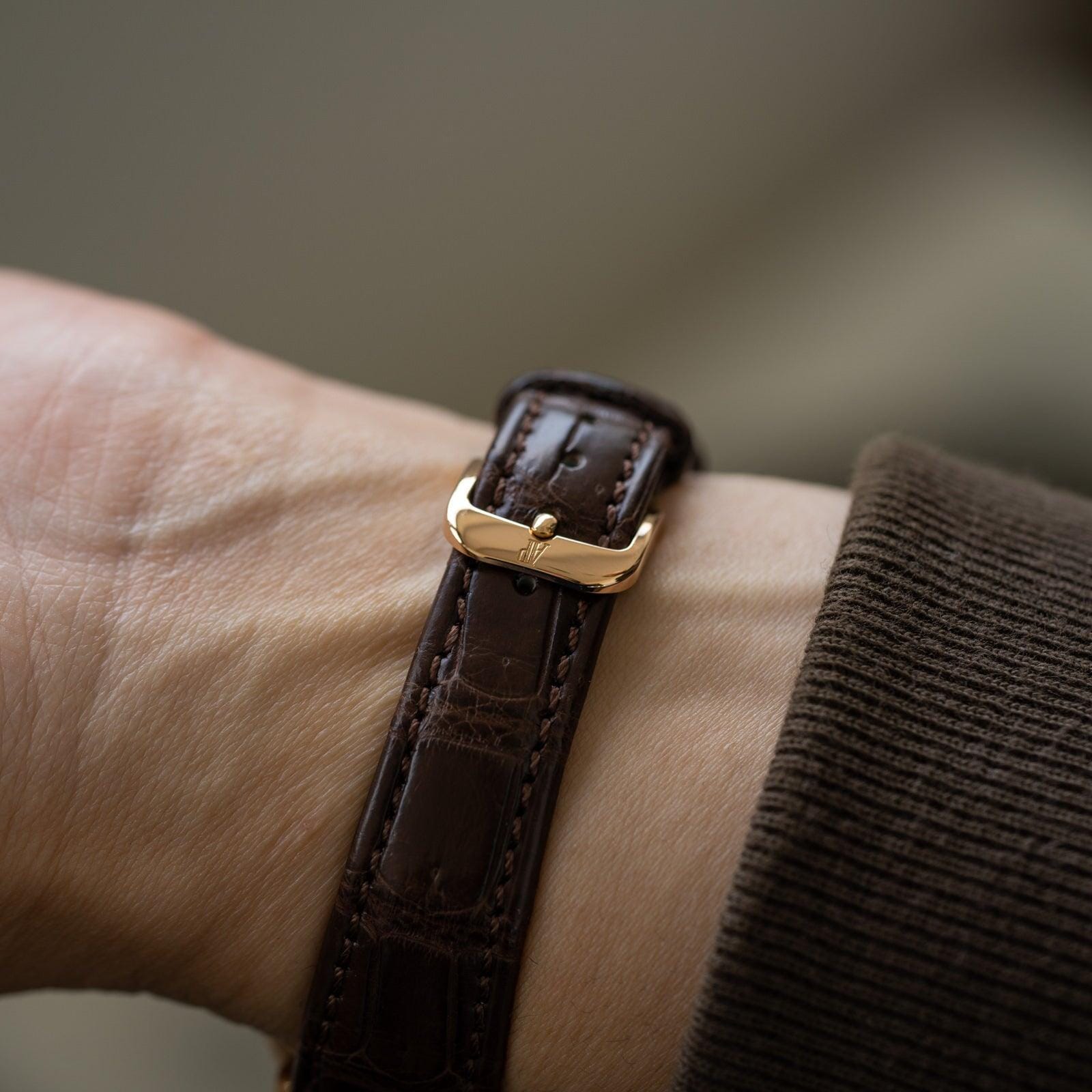 ゴールド素材の小ぶりで非常に薄いケース、2針のシンプルな文字盤、手巻きのムーブメントで構成されています。