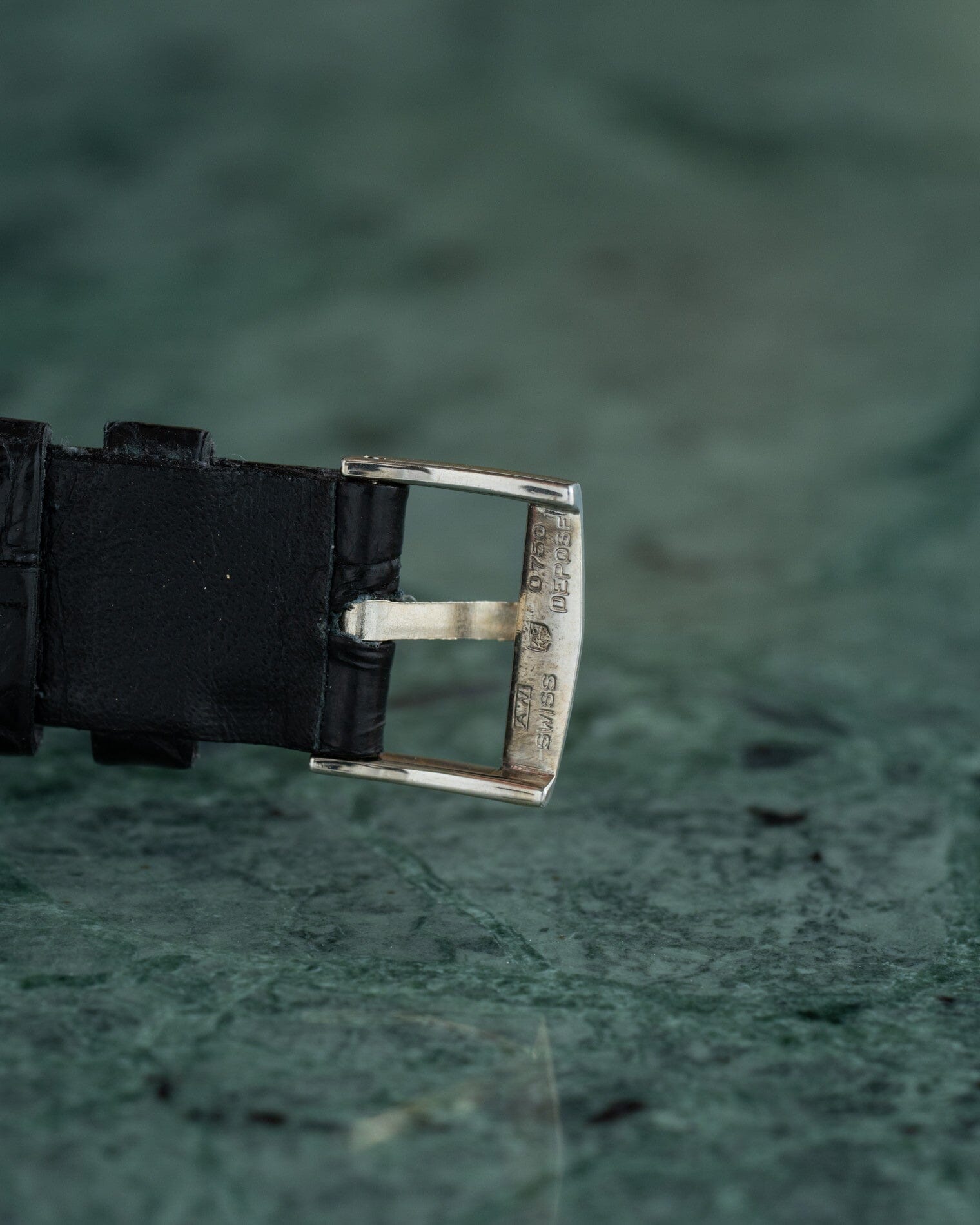 This watch is a hand-wound round watch made in the 1970s. An extremely thin case made of 18K white gold, sometimes referred to as extra flat. It features a flat bezel and curved lugs when viewed from the side.