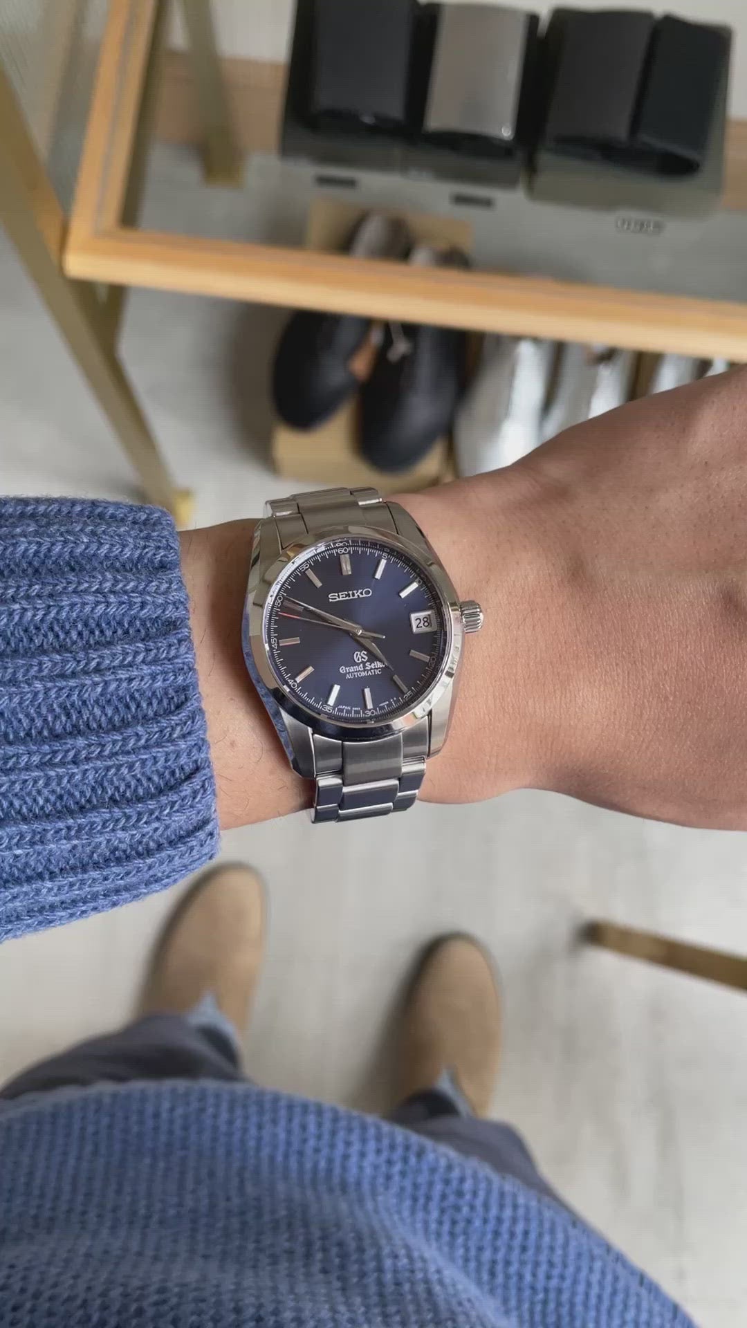 The dial is a navy dial, which is rare for Grand Seiko, and the second hand with one-point red is cool.
