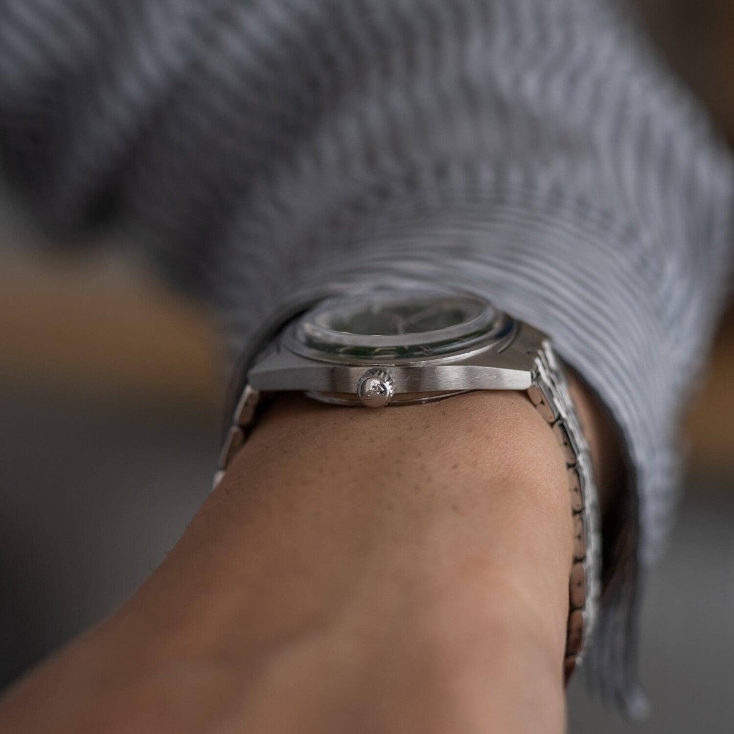 この時計の最大の特徴はグリーンマーブル模様のダイアルです。