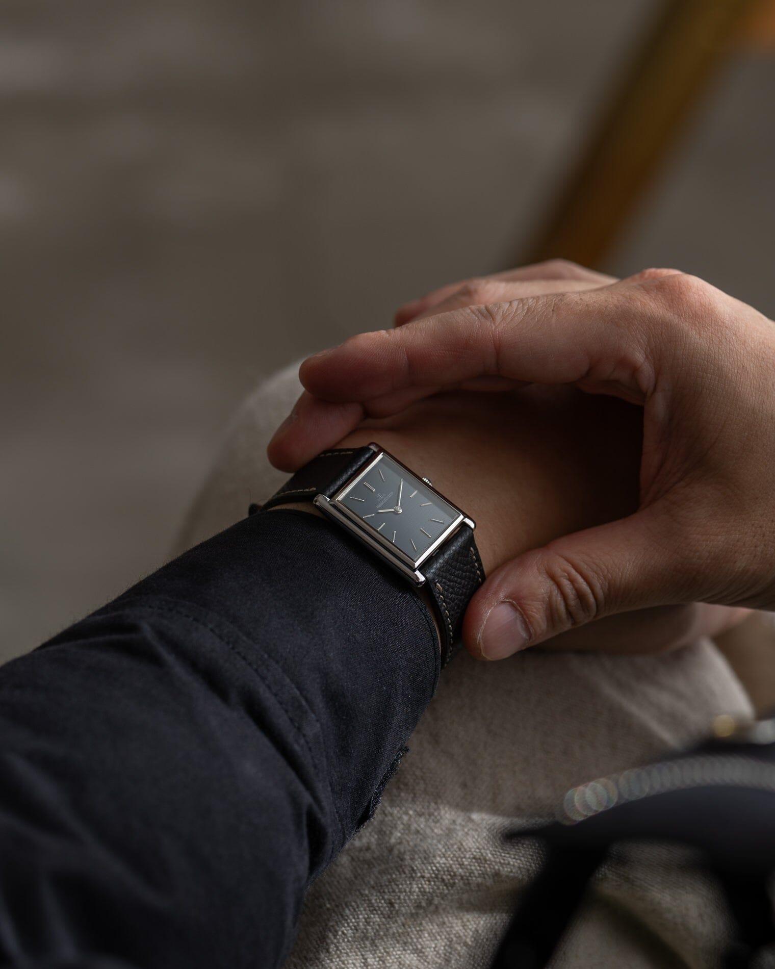 The dial is a matte navy. If you look closely, it looks like scales made up of triangles. This is a very rare type of pattern and you can feel the attention to detail.