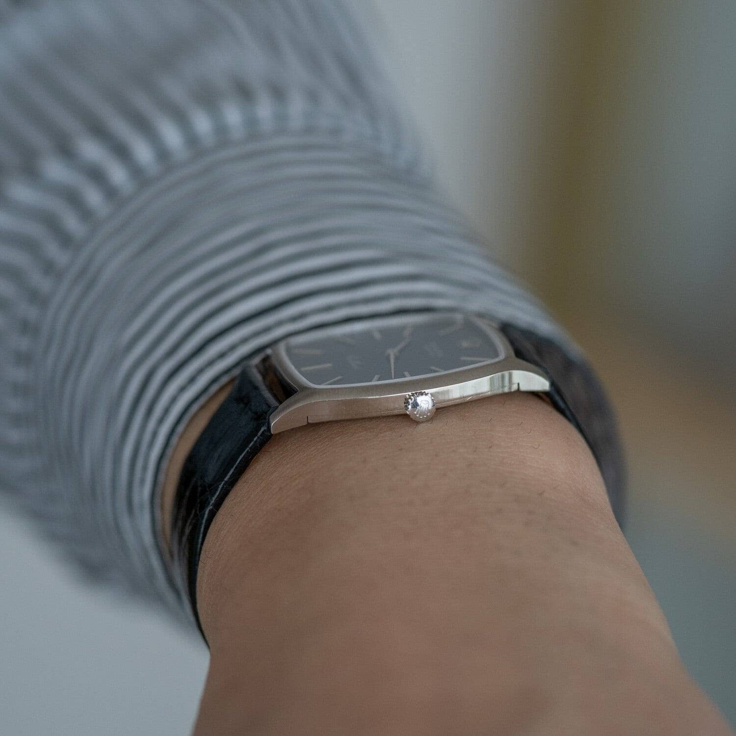 The white gold case looks at first glance like a stainless steel, but it has a good gold-like lustre and a luxurious feel.