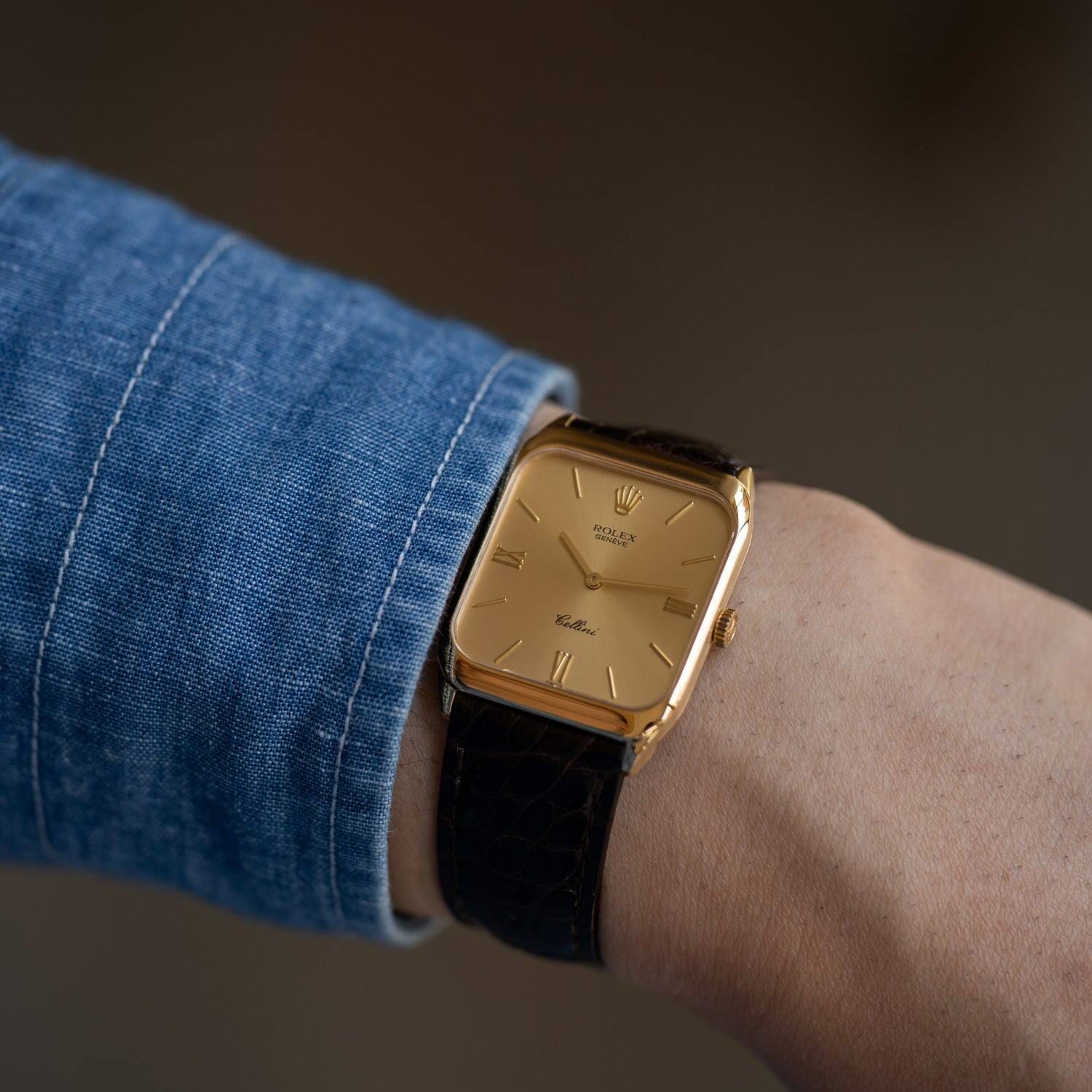 This is Rolex Cellini Ref.4135, has an unusual design with a rounded rectangular case.