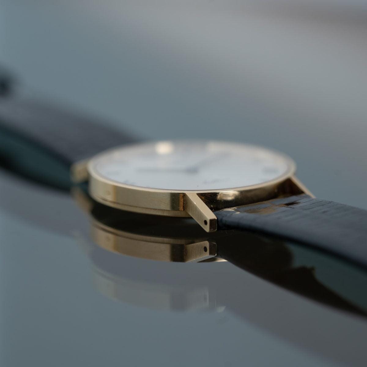 ケースには18Kイエローゴールドを使用しており、縁が非常に狭いケースデザインです。