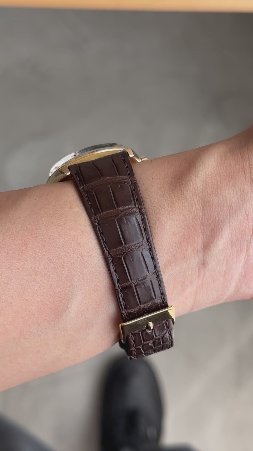 At the time, this watch was sold with a leather strap.The good thing is that it is not on a gold bracelet, so it is not so noticeable even though it is a solid gold watch.