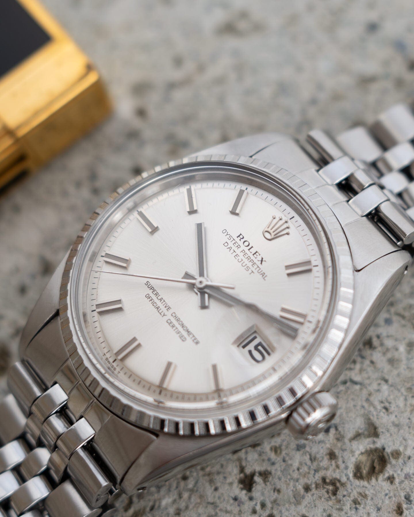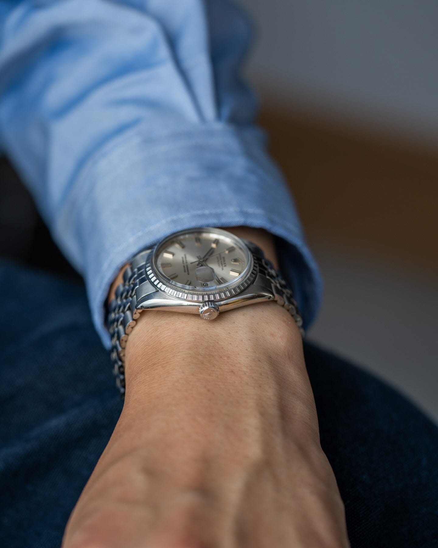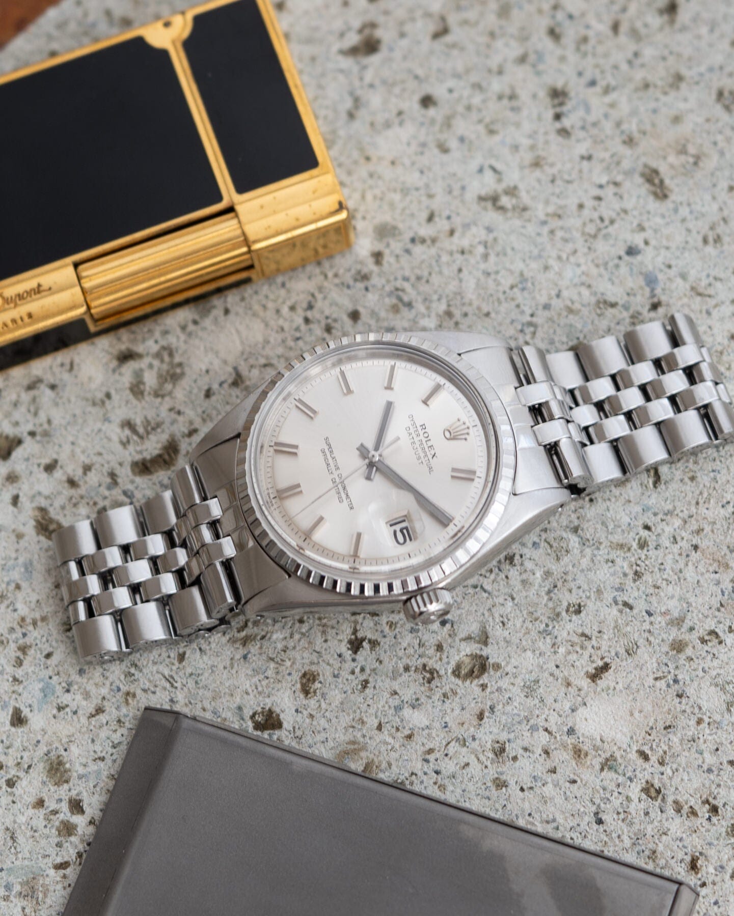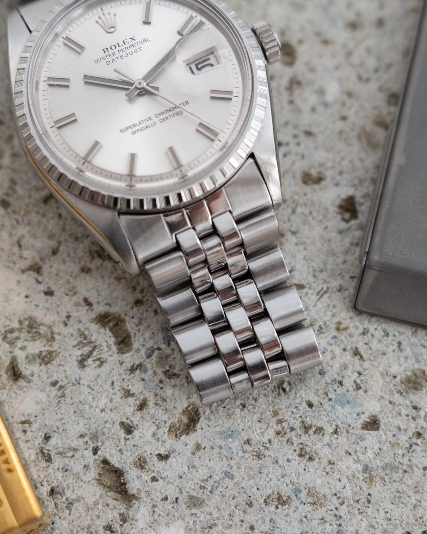 The rounded plexi crystal and the dial with one step down at the outer edge are also unique details of a vintage Datejust.