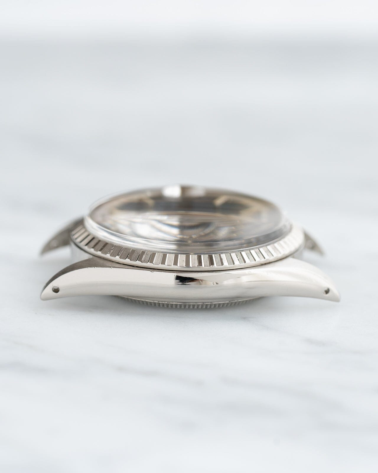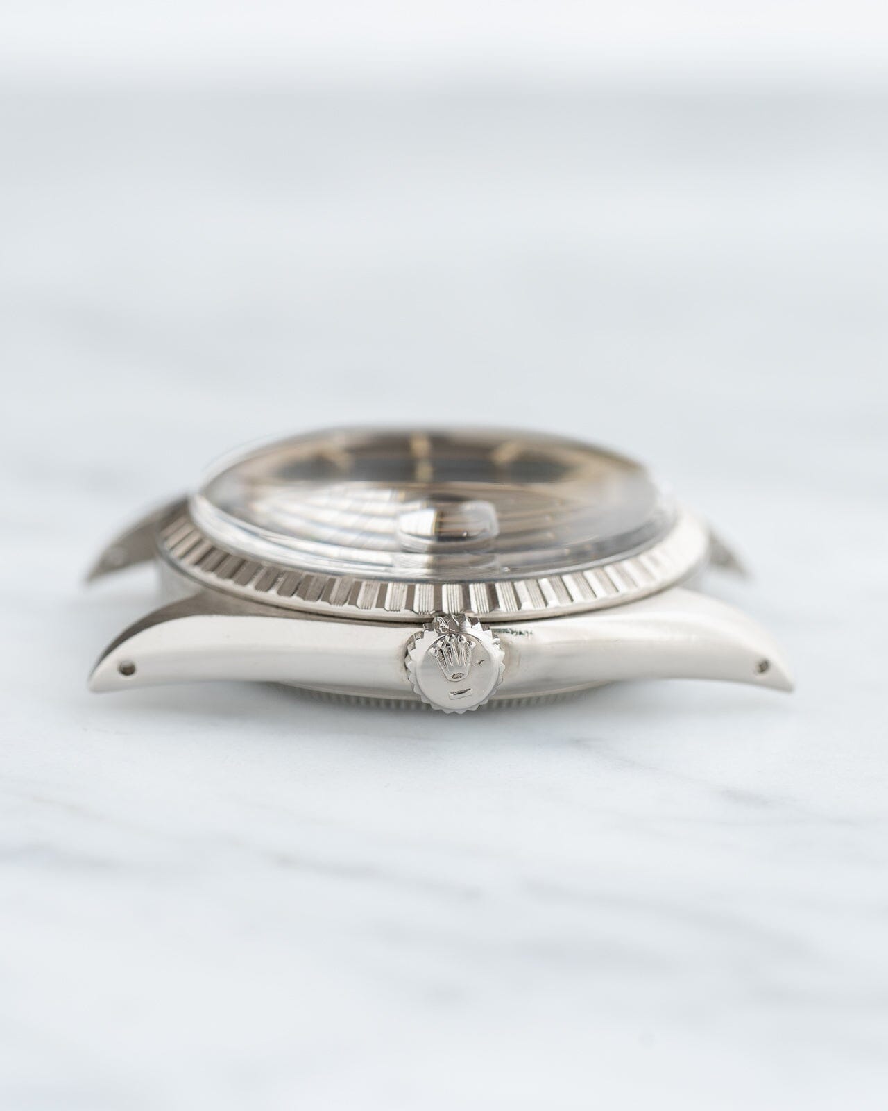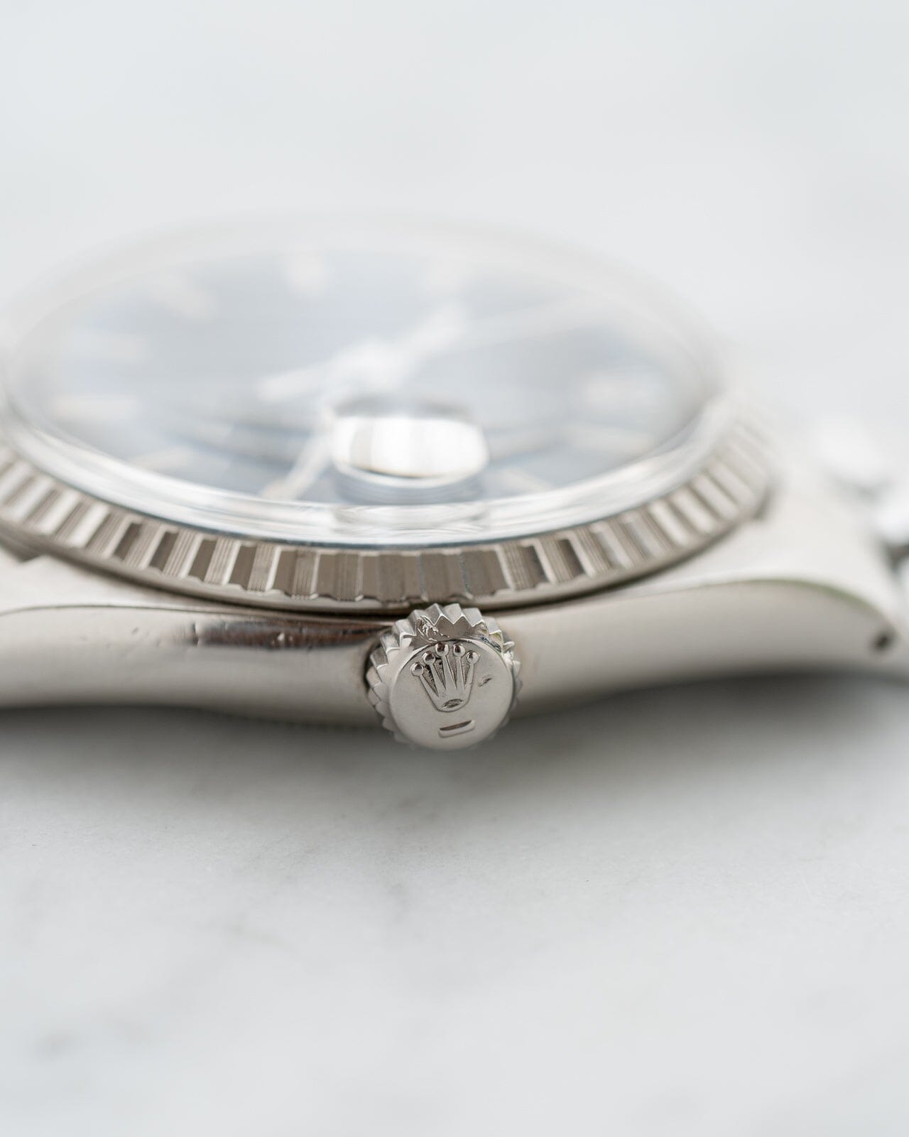 The rounded plexi crystal and the dial with one step down on the outer circumference are also details unique to vintage Datejust.
