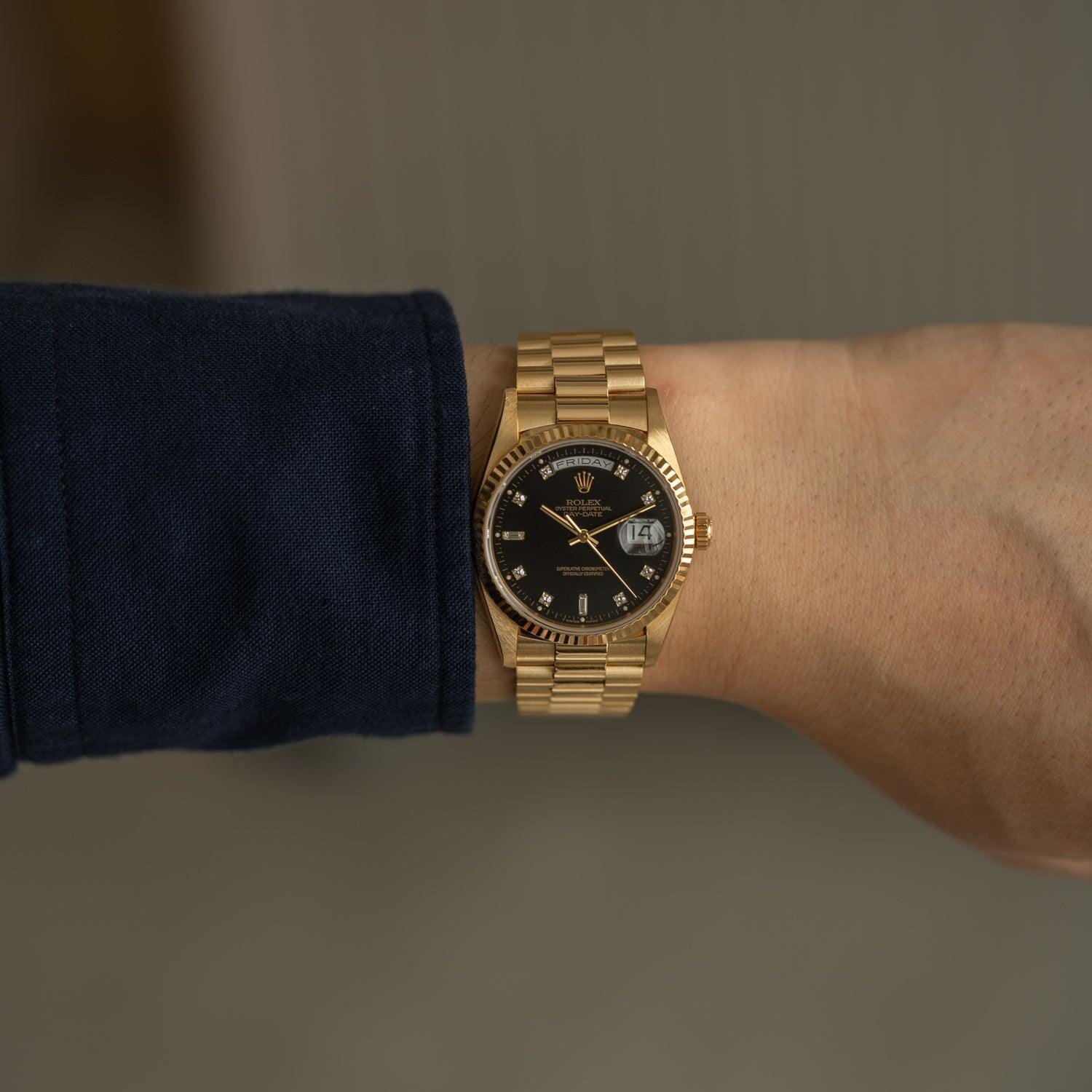 Introduced in 1956, the Day-Date was the world's first waterproof self-winding chronometer wristwatch with a date and full-spell day of the week on the dial.