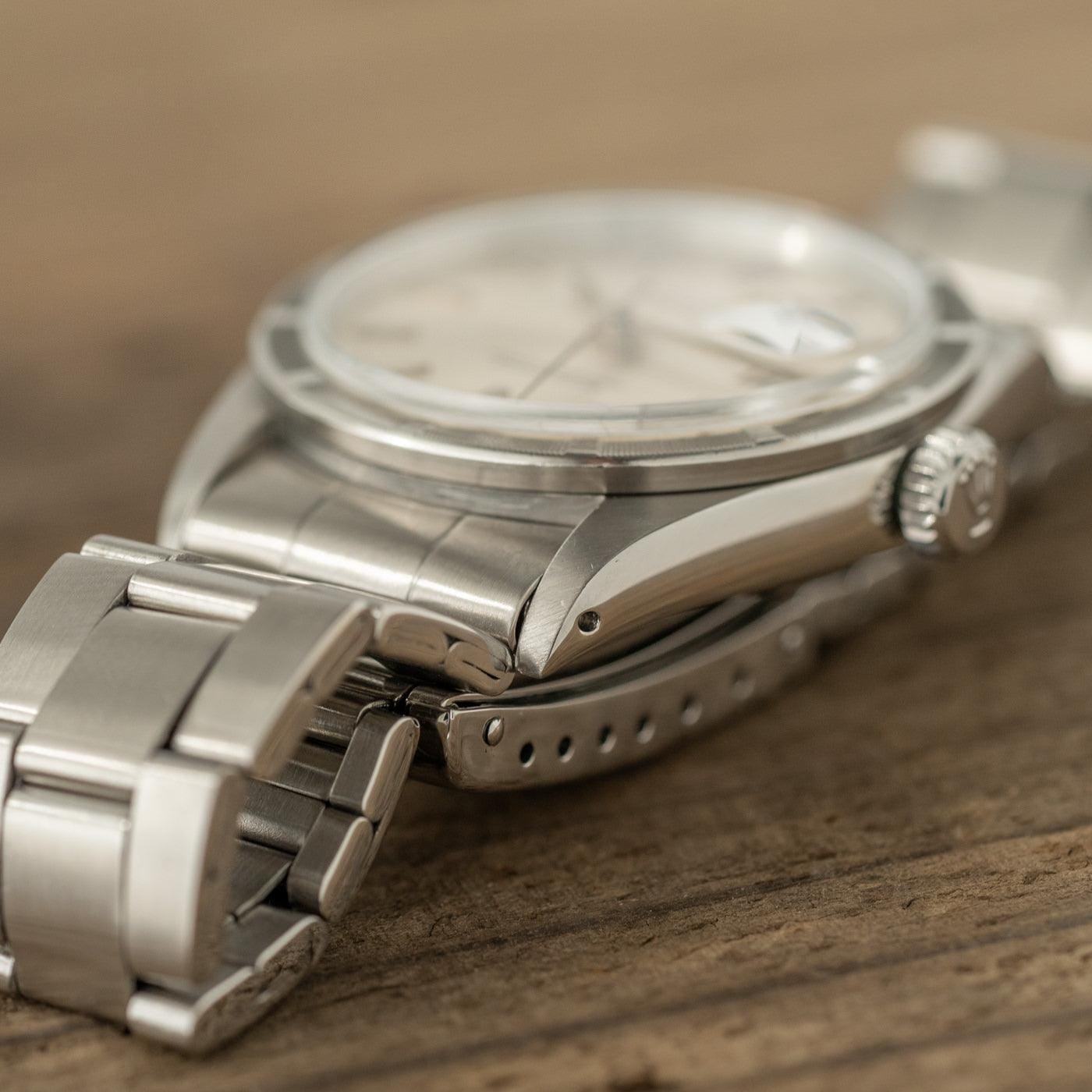 文字盤は経年変化の見られるシルバーダイアルで、やや内側に向かって細くなったインデックスとバーハンドというシンプルな組み合わせ。